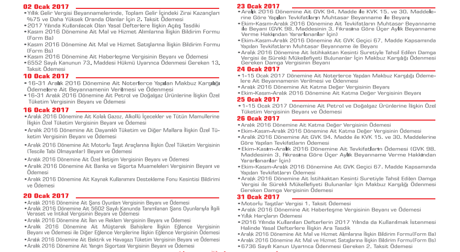 OCAK 2017 MALİ TAKVİM